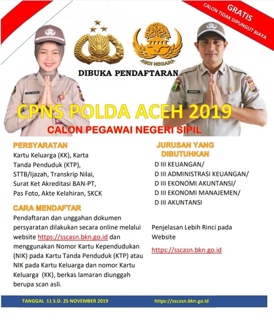 Kepolisian Republik Indonesia melalui Polda Aceh kembali membuka pendaftaran Calon Pegawai Negeri Sipil (CPNS) di lingkungan Polri T. A 2019.